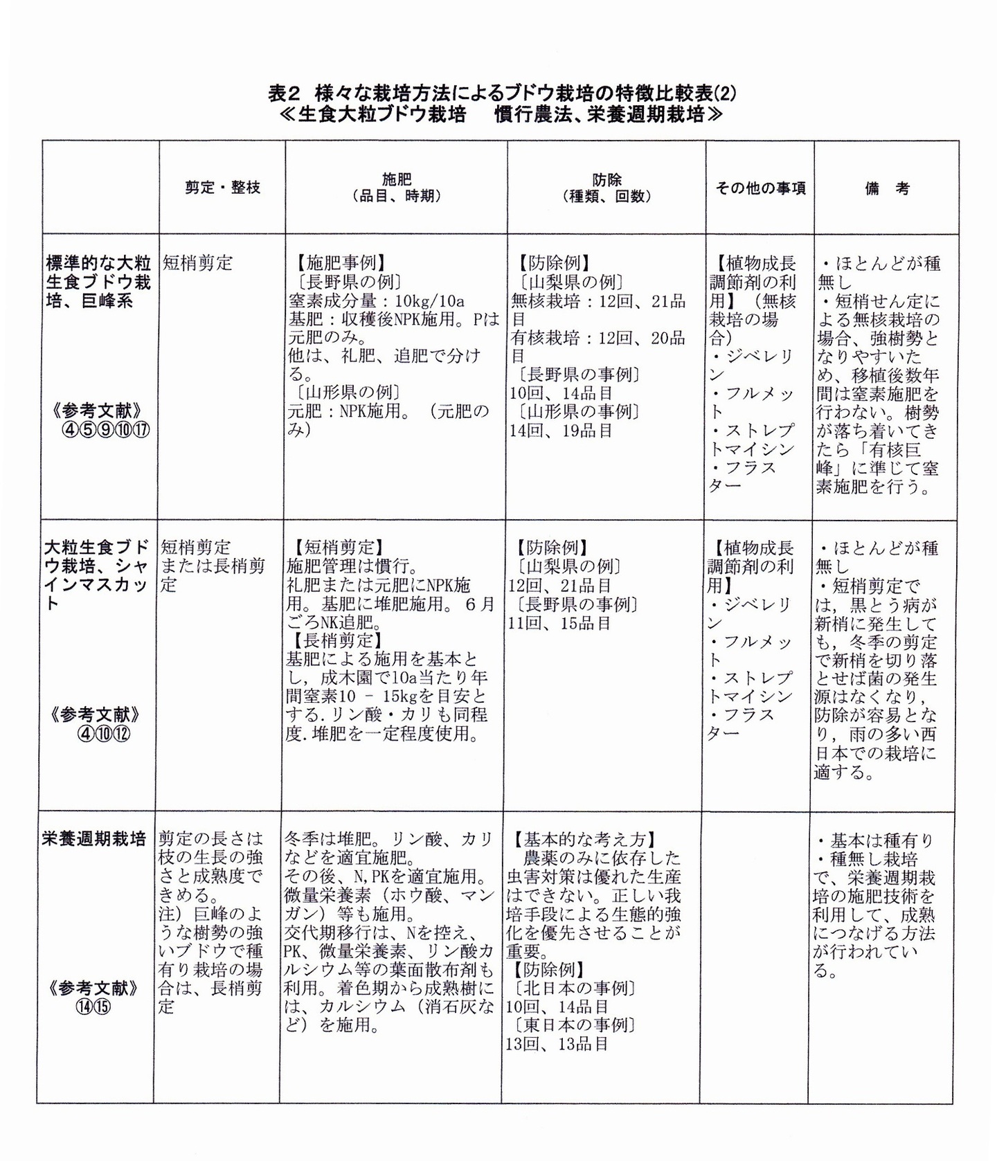 次に、慣行的な大粒生食ブドウ栽培について整理しました(表2)。巨峰系とシャインマスカットを分けてみました。種有りの情報も入っていますが種無しが主流です。この表の下段に栄養週期栽培を併記しました。