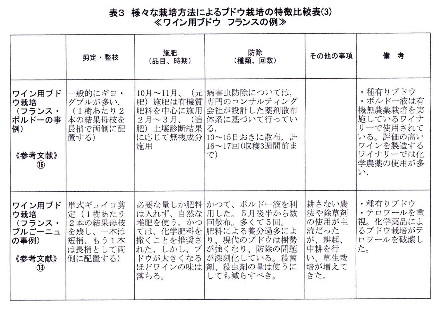 表に、いくつかのブドウ栽培の特徴を整理してみました(表1、表2、表3参照)。これらを比較しながら、環境保全的な栽培へ取り組むべき方向について考えてみたいと思います。