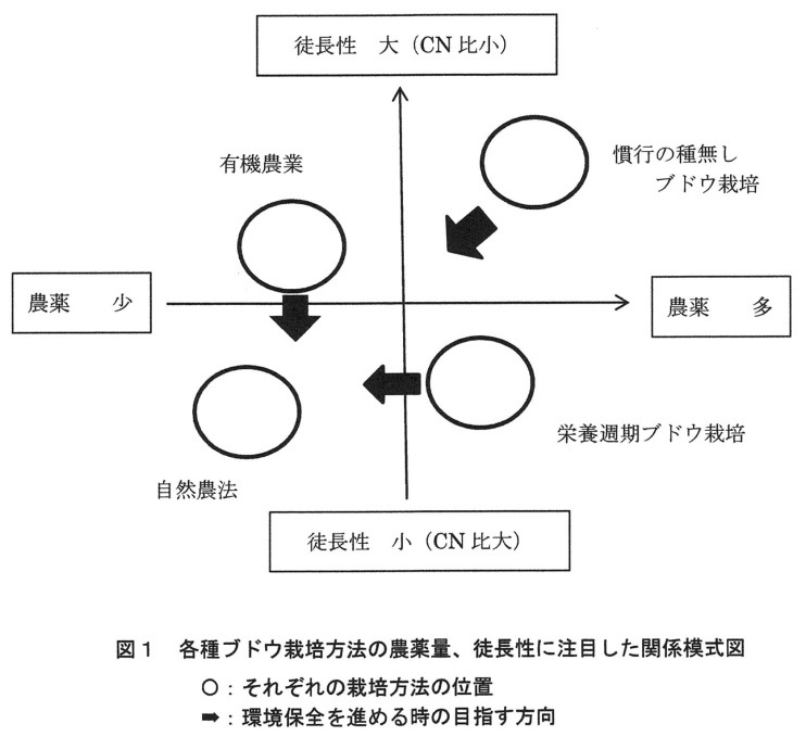 上記の図に、矢印➡を入れてみました。環境保全的なブドウ栽培を一層進めるのであれば、この方向を目指していくことが良いだろうということです。