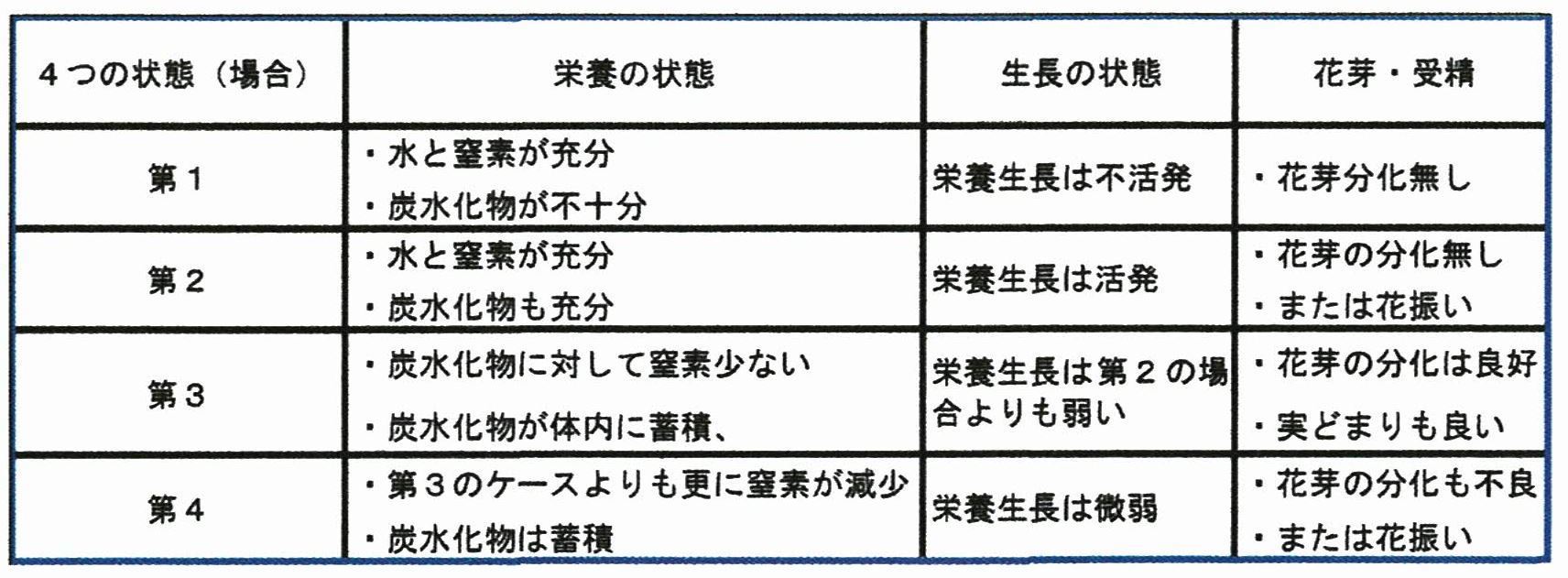 そのような状況ですが、炭水化物の樹体への蓄積が果樹の成熟の指標をなることを述べた論文があり、窒素と炭水化物の関係に目を向けています。