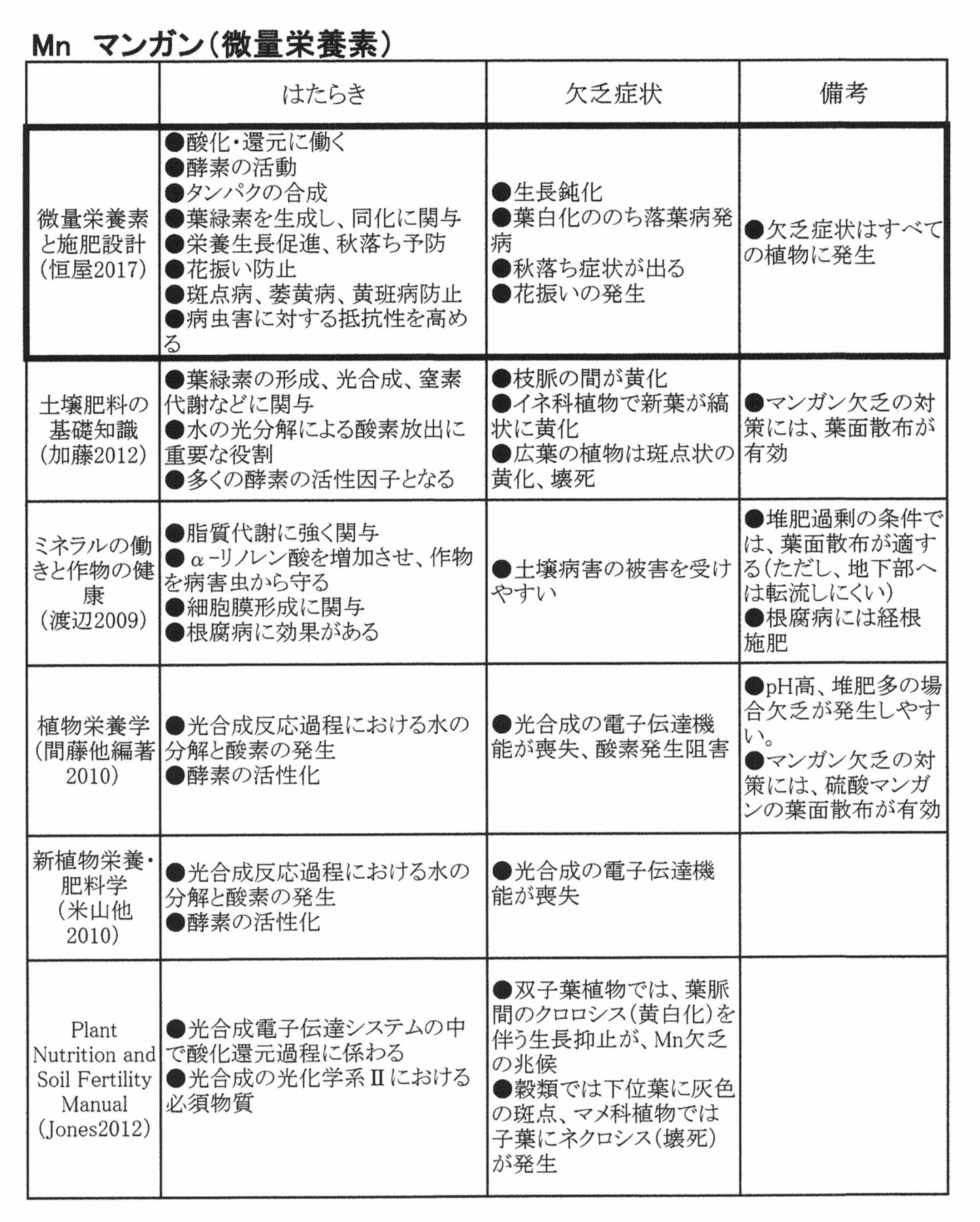 このページでは、作物栽培におけるマンガンの働きと、欠乏症状について比較的新しい情報を含めて整理してみました。次表に栄養週期栽培の書籍(恒屋2017)とその他の市販されている作物の栄養生理や栄養素に関する書籍の記載を要約して掲載しました。